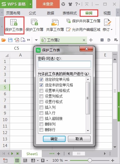 3.点击”审阅“--”保护工作表“,弹出保护工作表密码设置框,设置密码,保存。