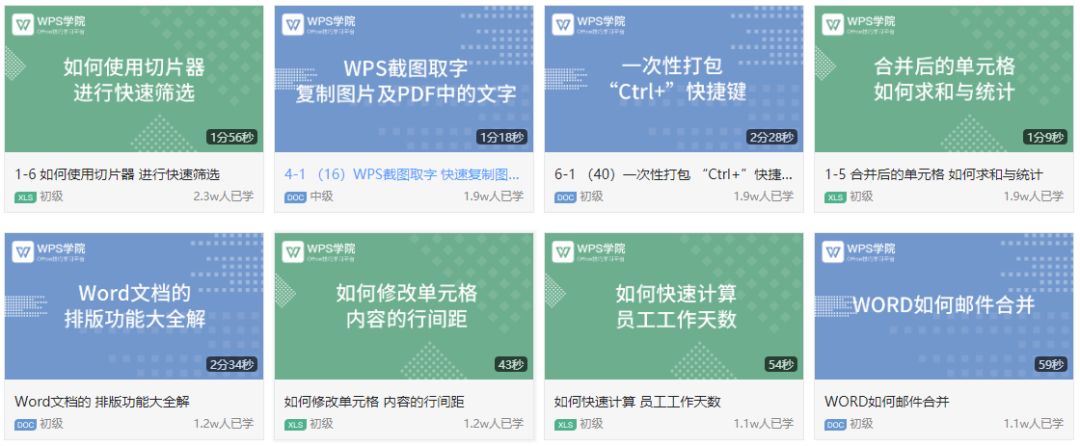 目前 WPS 学院共有 1000 多个视频教程,每篇都会针对使用场景而制作,不啰嗦不重复,每篇只需1-3分钟,就能直接解决问题,让你用得飞起。