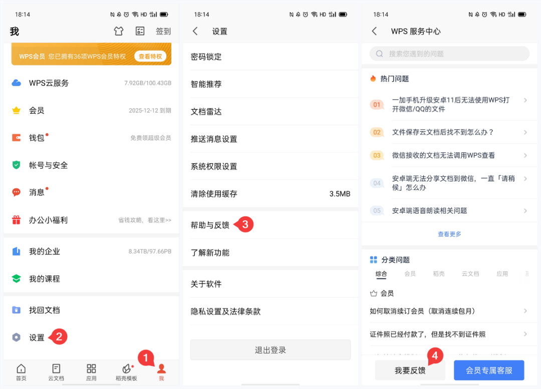 目前 WPS 支持更全面的服务及反馈入口,如果您在使用 PDF 文档加密或其他功能的过程中遇到任何问题,都可以通过「WPS服务中心」进行搜索或反馈。(上图为安卓端入口,iOS端需点击「设置」-「服务中心」)