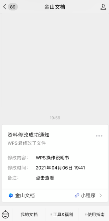 分享的文档被修改?一键可开启通知。 2021-04-28 20.8万人已阅读 文档分享出去后,你想知道对方修改了哪里吗?或者你担心被其他人乱修改吗?对于这种情况,WPS 有个小功能可以帮你轻松解决。在 WPS 文档的打开页中,点击右上角的「协作」按钮,勾选「关注文档修改」便可开启文档修改通知。紧接着只需用 WPS 链接分享文件,他人点击编辑文件内容时,你便能在 WPS Windows 版、金山文档微信公众号中获取修改通知。文档被谁修改、在什么时间修改,都能清清楚楚知道。不需要比对文档才能知道修改的地方在哪里,也不需要担心文档被随意修改,自己的文档内容有变化,自己就能第一时间知道。 推荐阅读 145 115 提示 网络原因,加载失败,请关闭重试。 复制链接,电脑端分享 复制链接 打开手机微信 扫描二维码一键分享好友 此内容对你有帮助吗? 有帮助 无帮助 * 无帮助的原因 描述不清 根据教程操作后未解决 这功能不好用 以上都不是 请完成必选 (选填) 请问还有其他建议吗? 无建议提交