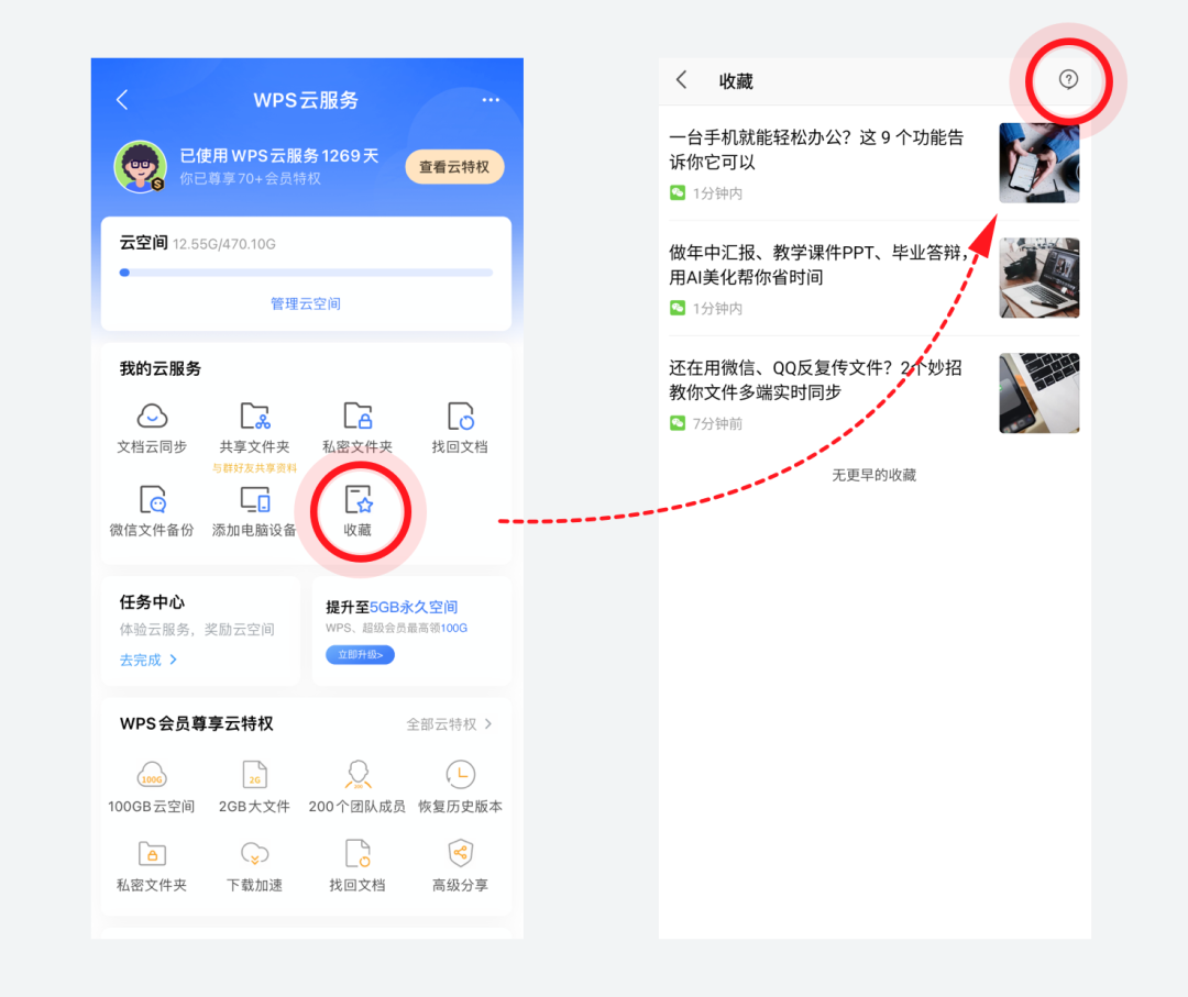 如果你不清楚如何使用WPS收藏功能,可打开WPS手机版,选择“云文档——我的云服务——收藏”,进入收藏服务页面后,点击右上角的 “ ?” 就能查知乎、微信、今日头条等平台详细的内容收藏教程。