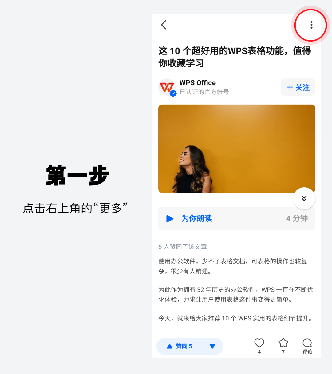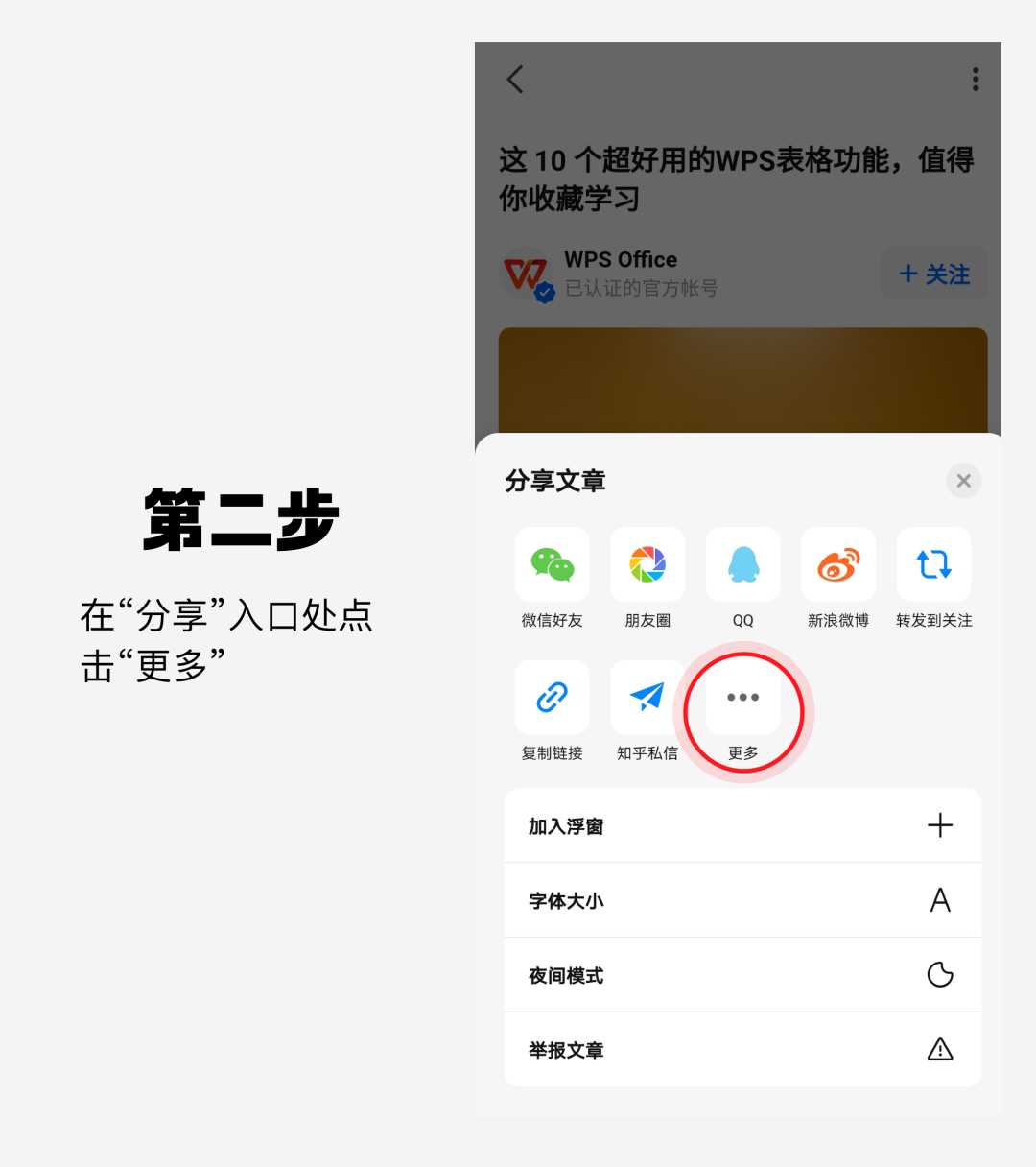 在知乎遇到喜欢的内容时,点击右上角的更多按钮,在“分享”入口处点击“更多”,选择 “收藏至WPS” 即可完成。