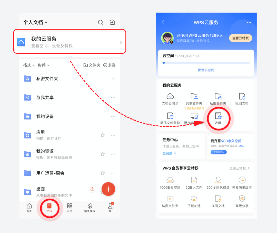 收藏完成后,打开WPS手机版,点击底部的“文档” ,选择 “我的云服务—收藏” 即可查看收藏过的所有内容。