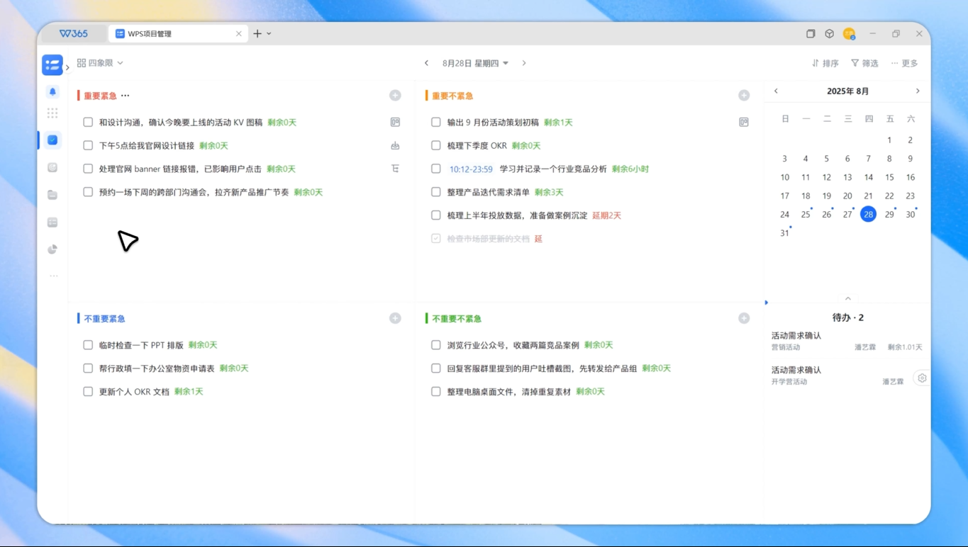 首页Office技巧WPS系列课团队协作系列课WPS项目管理应用课程 WPS项目管理应用课程 四象限视图 发布时间:2025-11-03 难度:初级 体验功能 提示 网络原因,加载失败,请关闭重试。 微信扫码 用手机继续看 重播 下一个 本教程适用版本:WPS Office For Windows 个人版 点此下载 此内容对你有帮助吗? 有帮助 无帮助 * 无帮助的原因 描述不清 根据教程操作后未解决 这功能不好用 以上都不是 请完成必选 (选填) 请问还有其他建议吗? 无建议提交