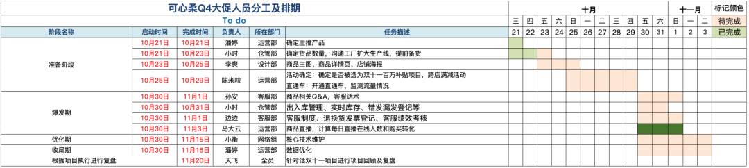 逐渐地,客服部配合顺畅了,整体客服效率至少有30%的提升,现在的客户满意度综合也随之提高很多。我们会在季度开始用脑图梳理本季的所有工作,列出主要待办事项。然后用在线表格做甘特图,输出每阶段的项目进度和落实到人的工作安排;最后用日历进行项目推进的时间管理,及时复盘我们的时间任务进度,确保项目产品正常上新。