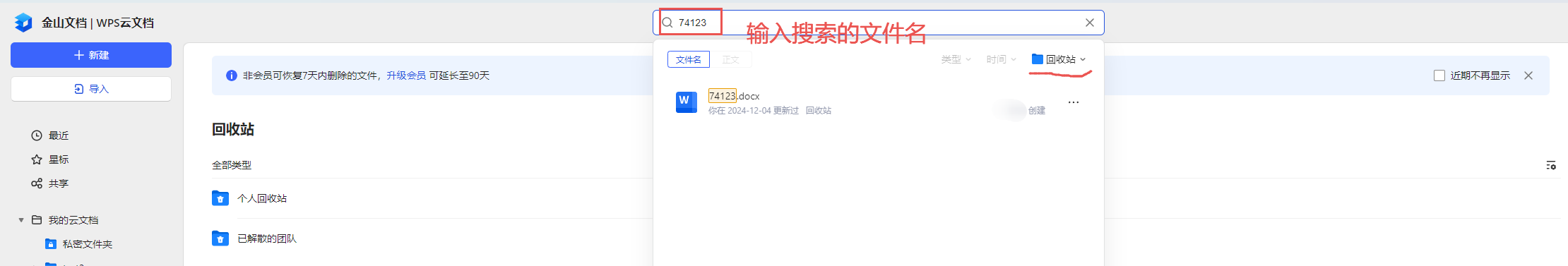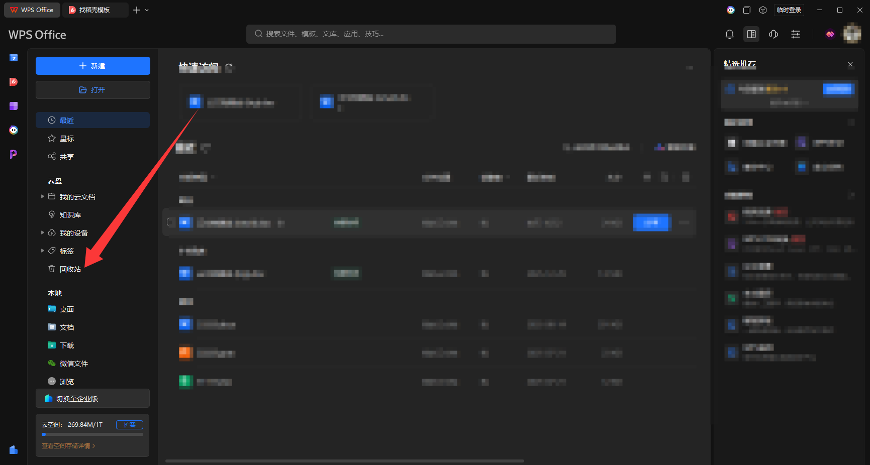 电脑系统回收站、wps回收站查看文件是否被删除,若被删除,可从回收站中恢复,WPS回收站入口如下: