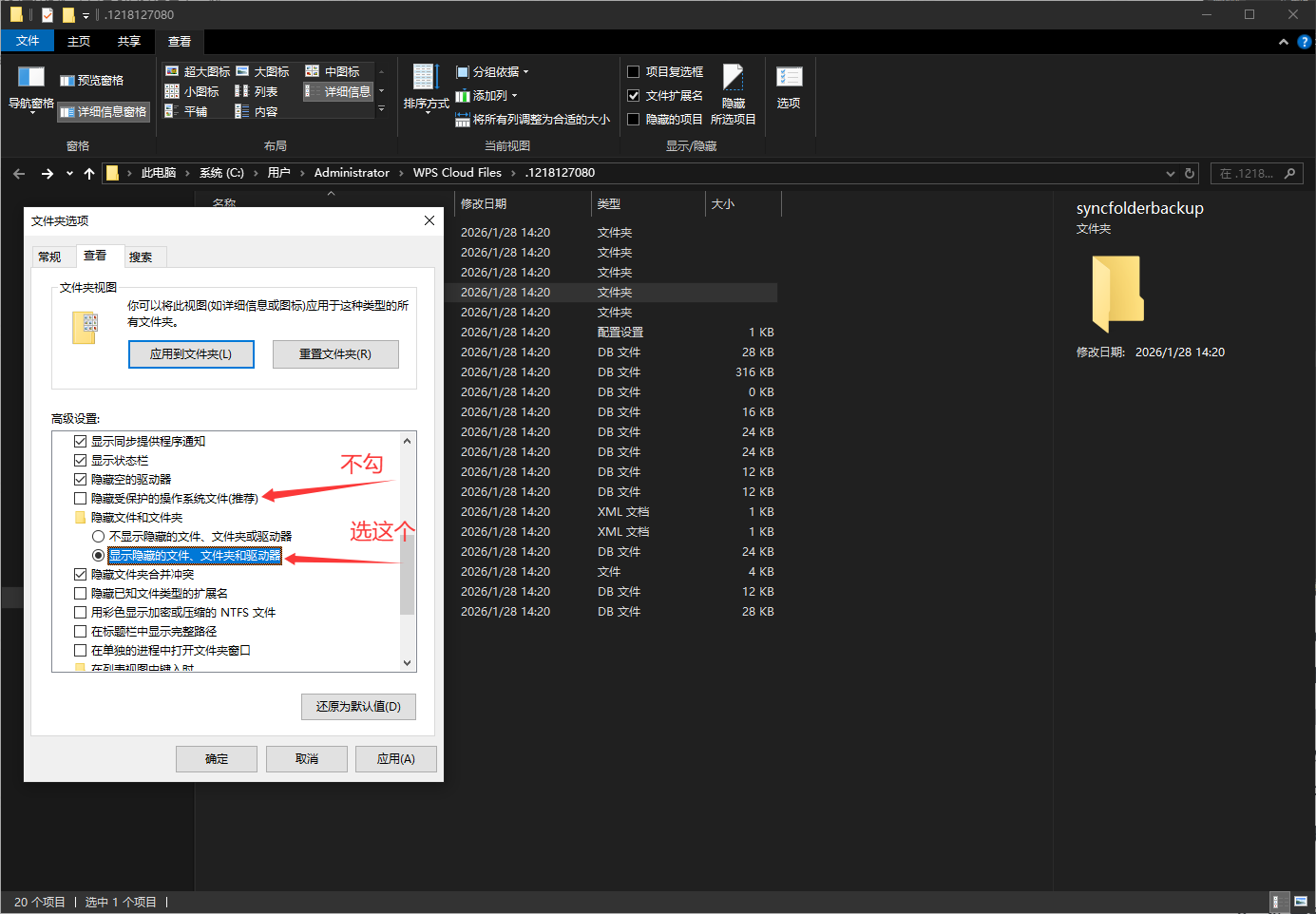 若在上诉方法中均无法找回对应文件,可尝试待非缓存目录所在的磁盘下的根目录,找到X:\$RECYCLE.WPS。,将显示隐藏文件夹和系统文件夹。勾选后看此目录是否有对应文件