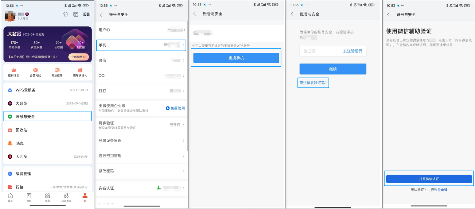 打开手机WPS的APP>点击“账号与安全”>“手机”>“更换手机”