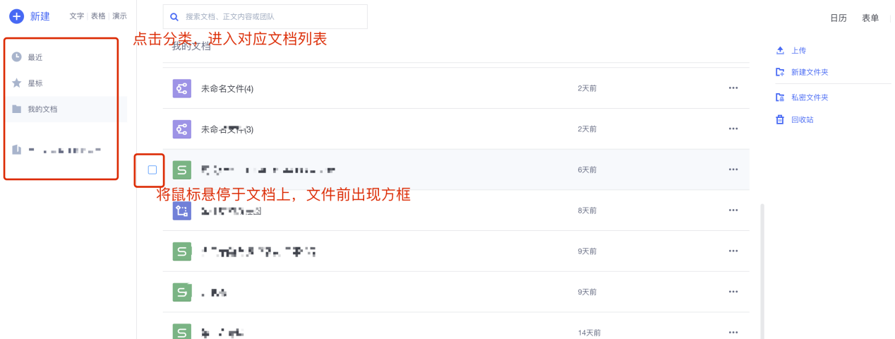首页技巧问答常见问题 批量删除云文档 2024-09-18 197人已阅读 0 0 进入云文档标签页(进入方式查看云文档入口),将鼠标悬停于列表中文档上,文件前出现“方框”,如下图所示: 此内容对你有帮助吗? 有帮助 无帮助 * 无帮助的原因 描述不清 根据教程操作后未解决 这功能不好用 以上都不是 请完成必选 (选填) 请问还有其他建议吗? 无建议提交