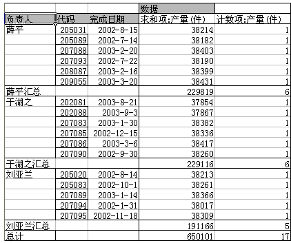 排序的依据可以是字段本身,也可以选择一个数据区域的字段。如按“求和项:产量(件)”排序,“负责人”为行为主体,“求和项:产量(件)”为数据,因此字段“负责人”的项的排序应该以“求和项:产量(件)”为准: