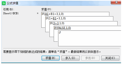 弹出“公式求值”对话框,对公式每个部分单独求值以调试公式。例如:我们需要对判断两个单元格的和是否大于3,通过IF函数进行判断并返回相应的值。
