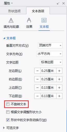 首页技巧问答常见问题 文本框中的文字没有随文本框移动而改变 2024-09-19 587人已阅读 0 0 双击文本框边框,在右侧属性窗口下进入“文本选项”,将“文本框”下的“不旋转文本”取消勾选。 此内容对你有帮助吗? 有帮助 无帮助 * 无帮助的原因 描述不清 根据教程操作后未解决 这功能不好用 以上都不是 请完成必选 (选填) 请问还有其他建议吗? 无建议提交