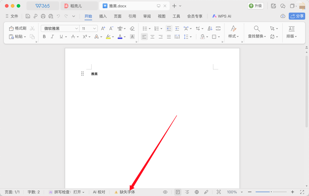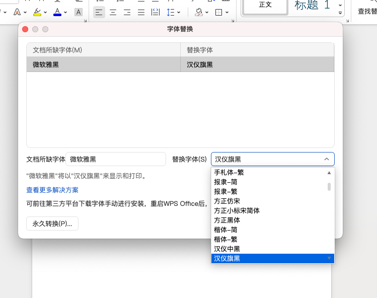 示例:如图所示,mac系统中通常不会自带微软雅黑字体,可以选择一键替换成其他的字体,或者从互联网上自行下载微软雅黑字体安装(微软雅黑字体wps无版权)