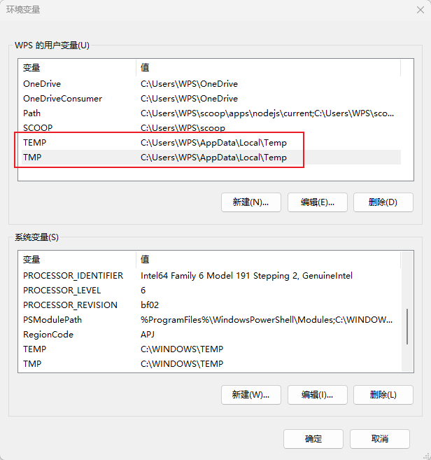 在用户变量区域,找到名为 「TEMP」 和「TMP」的变量;