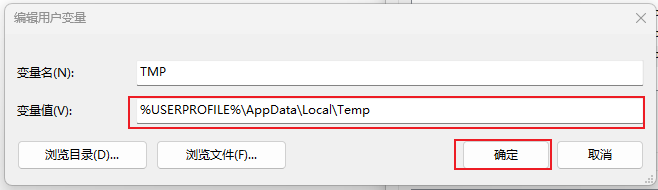%USERPROFILE%\AppData\Local\Temp修改完成后点击「确定」保存