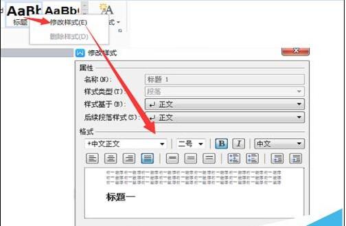3、工具栏上的标题规范是有默认字体和大小的,如果想要自己设置标题字体和大小。如图,可以把鼠标放到标题规范上,点击右键,选择修改样式,在弹出的窗口中进行修改就可以了。